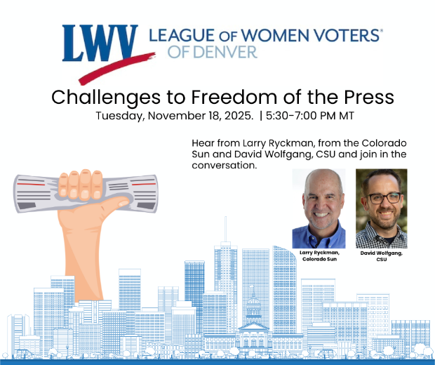 We continue to advocate for increased funding in the Mayor's 2026 budget for the Clerk and Recorder's Office (See our recent Action Alert to LWVD members).  Several League members attended the public hearing held by City Council on the city budget Monday, October 27.  LWVD spoke in support of adequate funding for the 2026 primary and general elections. The testimony can be found here and viewed here (our testimony starts at time 1:47:12).