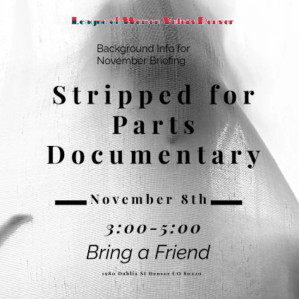 Enjoy a viewing of the documentary, Stripped for Parts with Leaguers and friends at Montview Presbyterian Church on Saturday, November 8. Then plan to attend the November Briefing (see above) by Zoom on November 18.